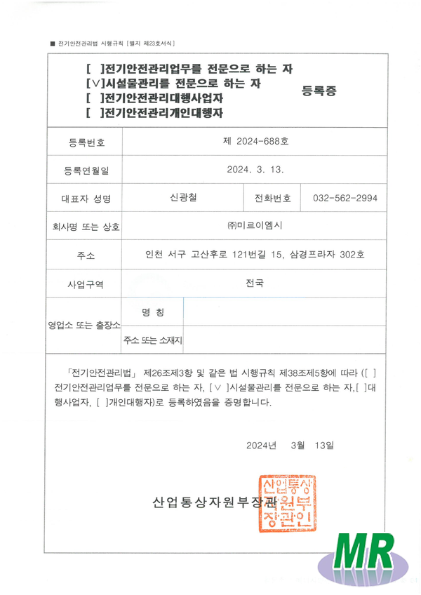 이에 당사는 ‘시설물관리를 전문으로 하는자’면허를 산업통상자원부에 등록하였습니다.